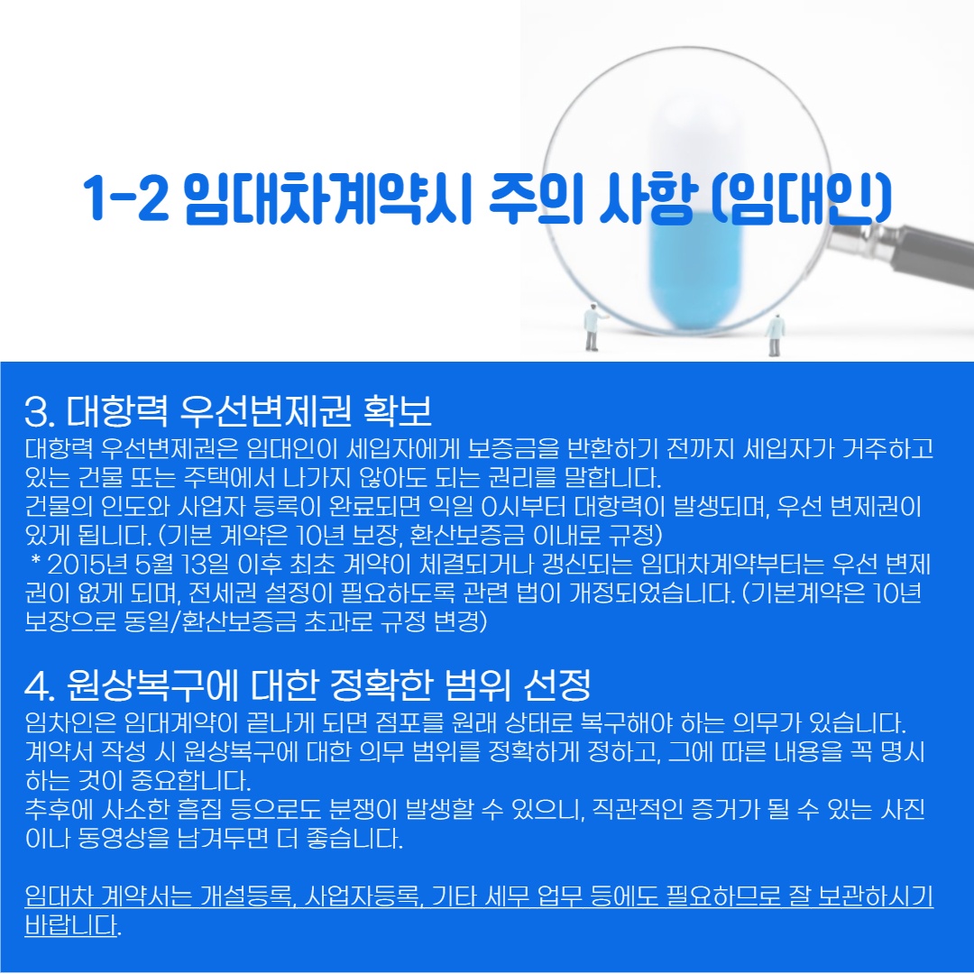 * 2015년 5월 13일 이후 최초 계약이 체결되거나 갱신되는 임대차계약부터는 우선 변제권이 없게 되며, 전세권 설정이 필요하도록 관련 법이 개정되었습니다. (기본계약은 10년 보장으로 동일/환산보증금 초과료 규정 변경)