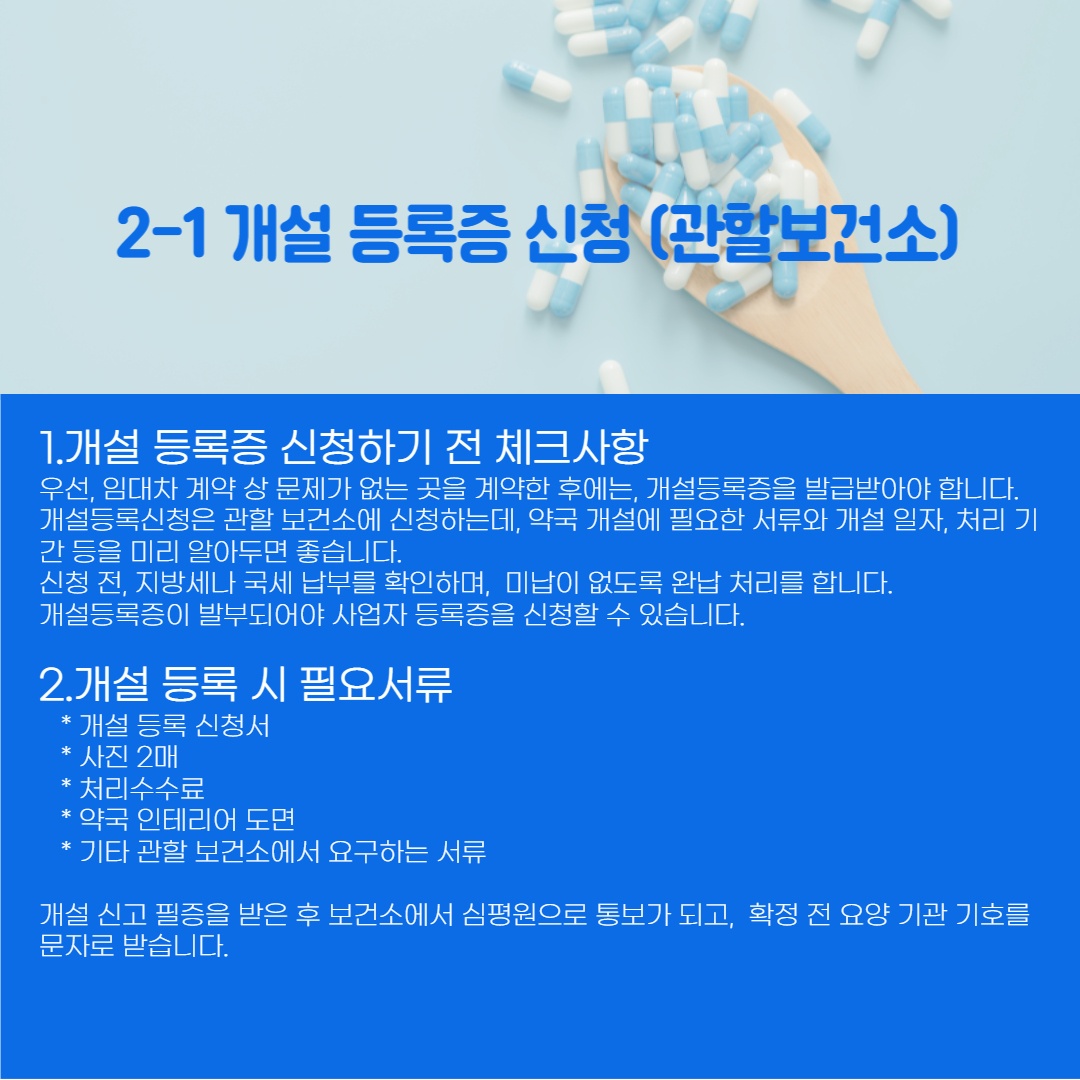 개설등록신청은 관할 보건소에서 신청하는데, 약국 개설에 필요한 서류와 개설 일자, 처리 기간 등을 미리 알아두면 좋습니다.