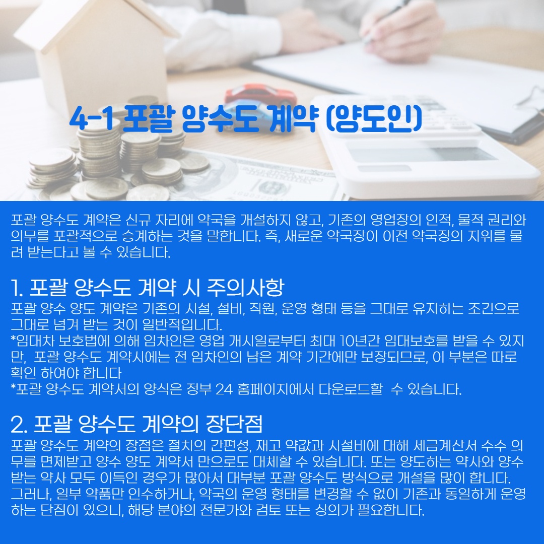 포괄 양수도 계약은 신규 자리에 약국을 개설하지 않고, 기존의 영업장의 인적, 물적 권리와 의무를 포괄적으로 승계하는 것을 말합니다. 즉, 새로운 약국장이 이전 약국장의 지위를 물려 받는다고 볼 수 있습니다.